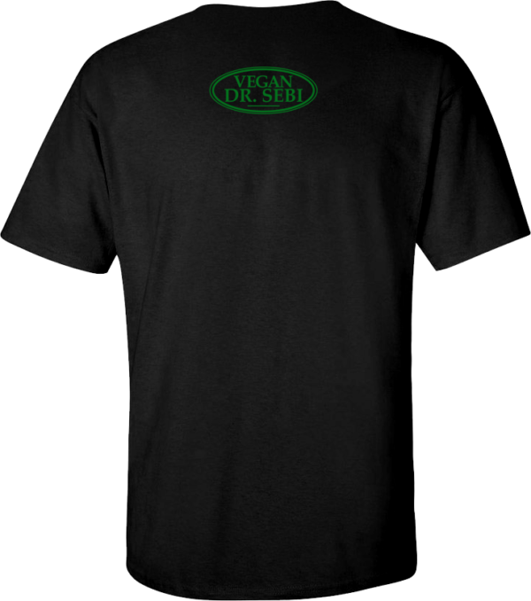 The back of the shirt says: “In a world of people who couldn’t care less, be someone who couldn’t care more” along with the Vegan Dr. Sebi logo above it.